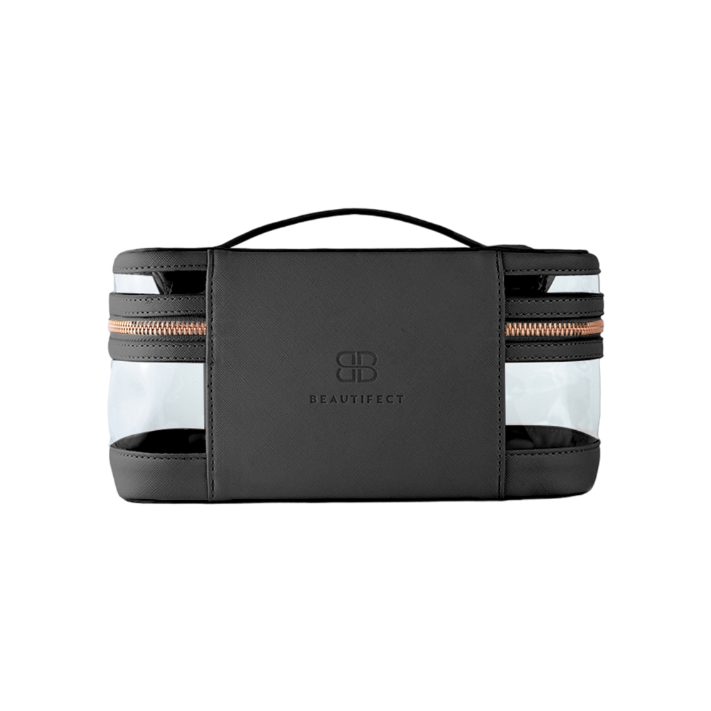 Your new essential beauty must-have, featuring luxury vegan leather exterior with Beautifect signature zip finishes and soft faux-suede lining. The durable clear exterior with three designated compartments, keeps items visible, organized and effortless to find. Chic, compact, practical and ready to go.
